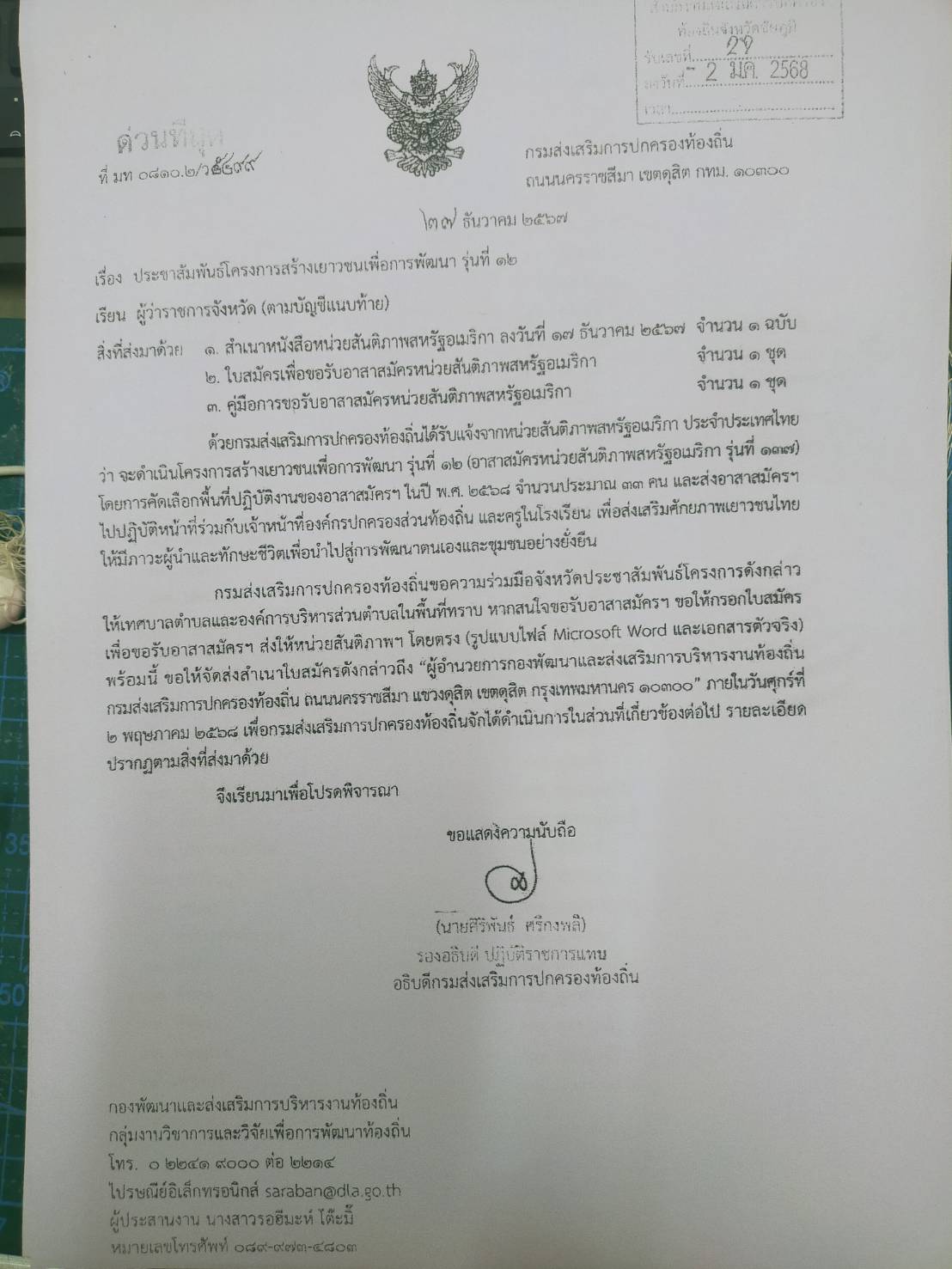 เปิดรับสมัครองค์กรปกครองส่วนท้องถิ่นระดับตำบล (อบต. / เทศบาลตำบล) ที่สนใจรับอาสาสมัครชาวอเมริกัน ของหน่วยสันติภาพสหรัฐอเมริการุ่นที่ ๑๓๗ ภายใต้โครงการสร้างเยาวชนเพื่อการพัฒนา (Youth in Development) เพื่อร่วมทำงานกับบุคลากรในท้องถิ่นในการพัฒนาเด็กและเยาวชนในด้านทักษะชีวิต ภาวะผู้นำ ทักษะการสื่อสารภาษาอังกฤษ และแลกเปลี่ยนเรียนรู้วัฒนธรรมกันเป็นเวลา ๒ ปี สนใจโปรดสแกนคิวอาร์โค้ดอ่านรายละเอียดในคู่มือใบสมัคร และแสกนคิวอาร์โค้ดเพื่อดาวโหลดใบสมัคร ปิดรับภายในวันที่ ๒ พฤษภาคม ๒๕๖๘ นี้ ไม่มีค่าใช้จ่าย